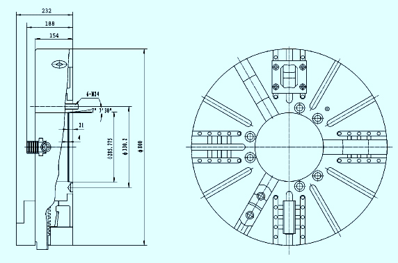 ■特點(diǎn): ☆短圓錐連接。 ☆三爪自定心,四爪單動(dòng)。 ☆適用于軸類或異形零件。 ■Specificity: ☆Short-taper mounting. ☆Three-jaw self-centring,four-jaw independent. ☆Suitable for machining shaft or special shapes workpiece.