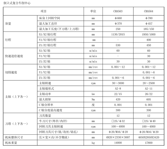 CHA564立式復合車削中心,是帶有雙立式(一正一倒)主軸和配備雙動力回轉刀架的立式復合車削中心,可以實現(xiàn)一次裝卡,完成工件的兩面加工。該機床在各項技術指標上均達到了國際先進水平,又具備相當高的自動化程度,主要用于加工盤套類、批量化生產的零件,如汽車行業(yè)的剎車盤、剎車鼓等。 主軸帶有C軸功能(選項配置),配合刀塔上的回轉刀具可以完成銑、鉆、攻絲等多種工序加工。 該機床具備六個直線進給軸,兩個主軸配合C軸可以分別實現(xiàn)三軸聯(lián)動加工。 該機床的動力刀塔具備45度范圍內的A軸分度的加工功能(選項配置),從而實現(xiàn)在工件上加工斜面、斜孔等工序,擴展了可加工件的范圍。 本機床配備有送料機構,非常適合組成生產線,針對剎車盤工件還可以提供雙面車、雙面磨等選擇功能。